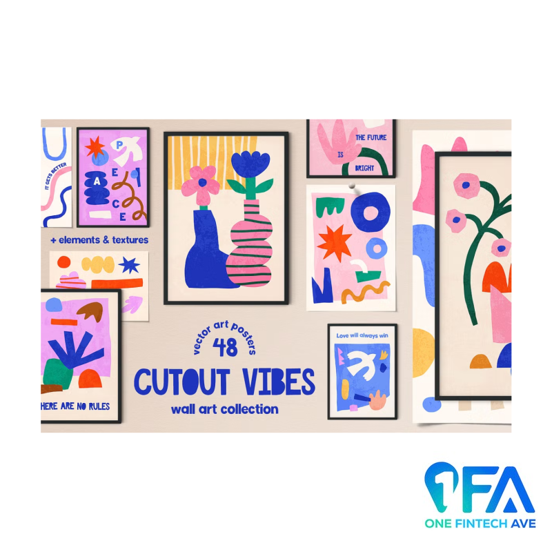 Cutout Vibes Collection includes 48 modern pre-made posters, 5 vector textures, and 392 elements for creating your unique design. You can resize and recolor all posters and elements in editable vector files.