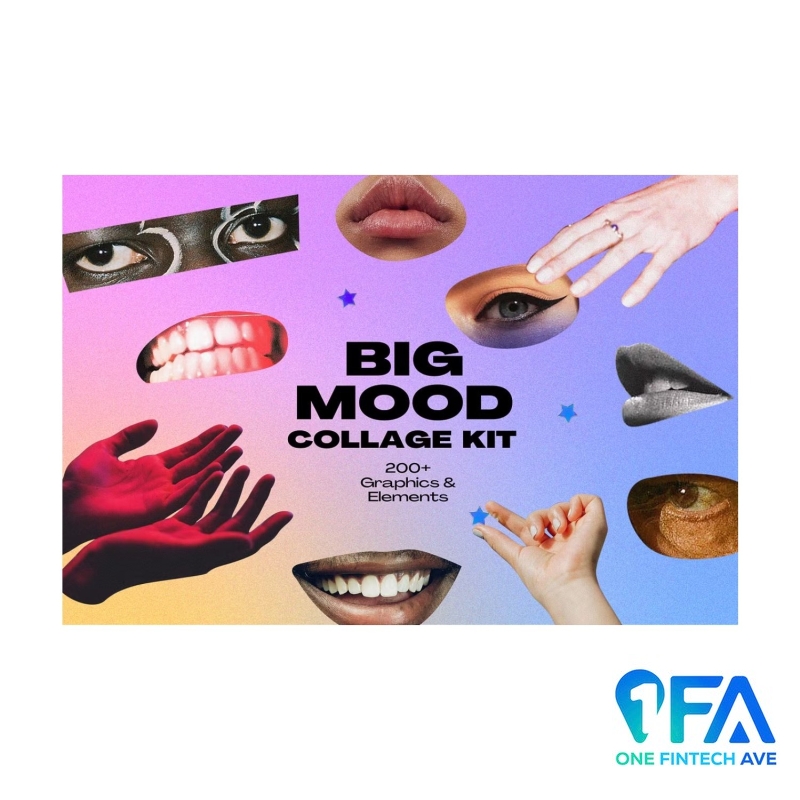 Big Mood collage kit features more than 200 cut-outs of Hands, Eyes, and Mouth. These can be used to add bold extra flavor to a variety of designs, art, and merchandise. Also includes custom hand-made collage elements like paint brush strokes and colorful paper scraps.
