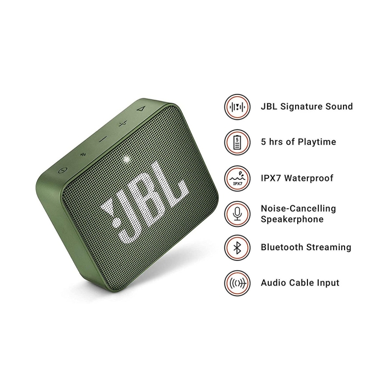 The JBL GO 2 is a full-featured waterproof Bluetooth speaker to take with you everywhere. Wirelessly stream music via Bluetooth for up to 5 hours of continuous JBL quality sound. Making a splash with its new IPX7 waterproof design, GO 2 gives music lovers the opportunity to bring their speaker poolside, or to the beach. GO 2 also offers crystal clear phone call experience with its built-in noise-cancelling speakerphone. Crafted in a compact design with 12 eye-catching colors to choose from, GO 2 instantly raises your style profile to all-new levels.