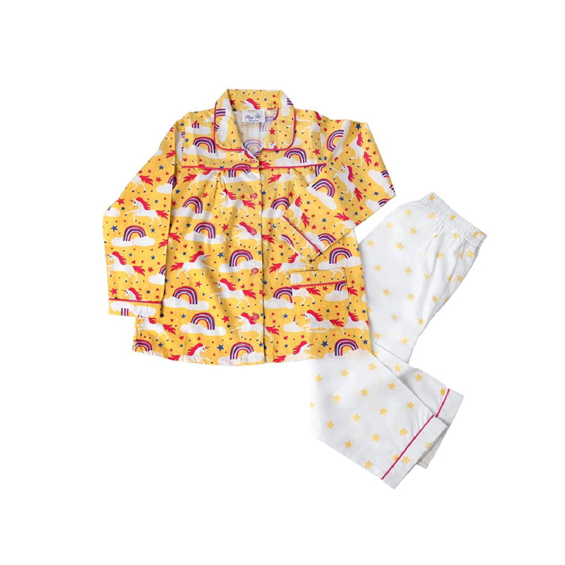 The package includes 1 piece shirt with front button closure and 1 piece pyjama with the softest drawstring elastic making sure your child sleeps comfortably throughout the night without worrying about rashes or discomfort.