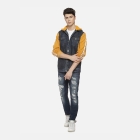Charcoal washed colourblocked windcheater denim jacket, has a hooded, 4 pockets ,has a button closure, long sleeves, straight hemline, cotton lining